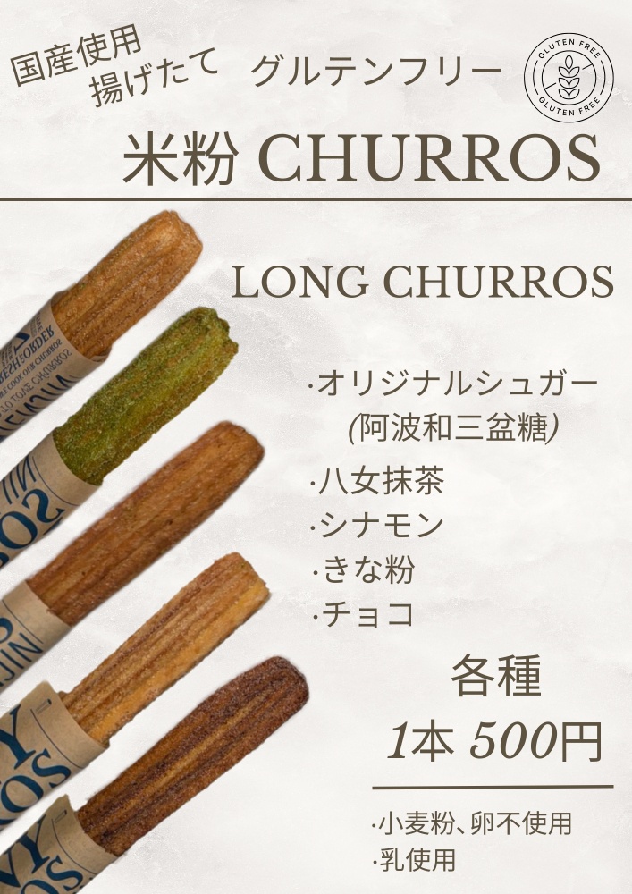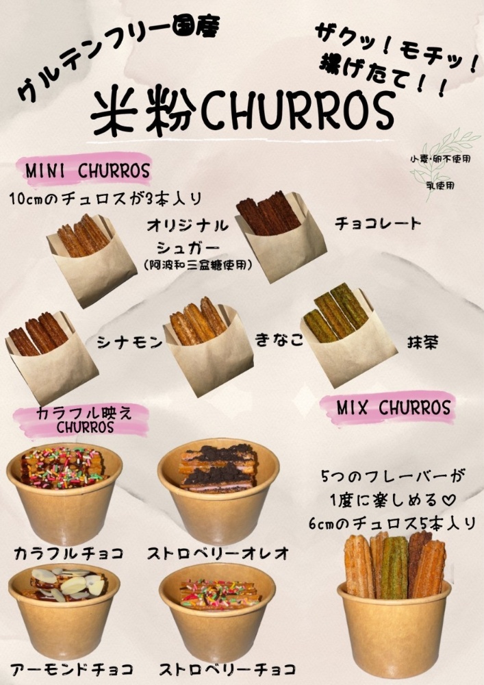 国産使用グルテンフリー米粉チュロスを販売していますその他にも出店先に応じてふぅふぅのたこ焼き、揚げたこ焼き手羽先チューリップ唐揚げフライドポテトなども販売しています